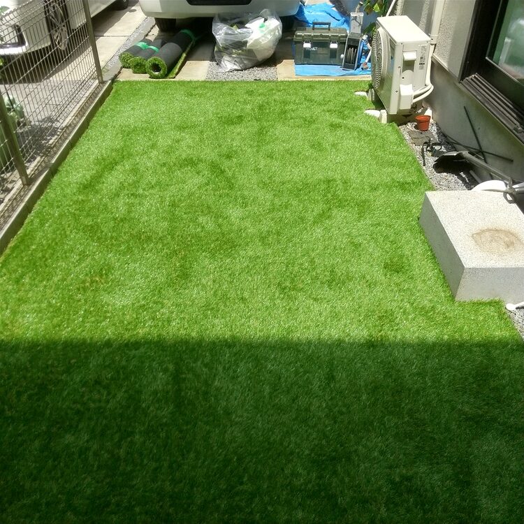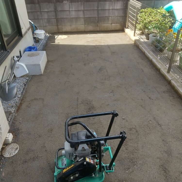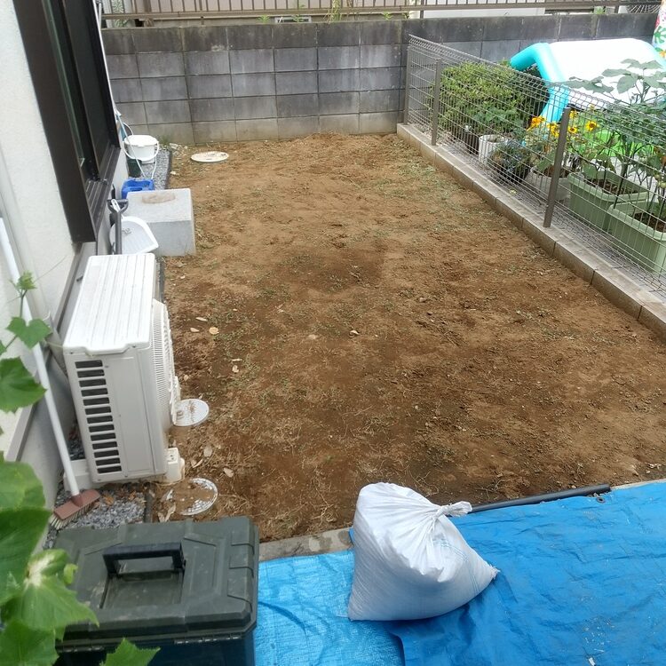 凸凹のお庭も、固く平らな人工芝専用の下地に調整し直します。